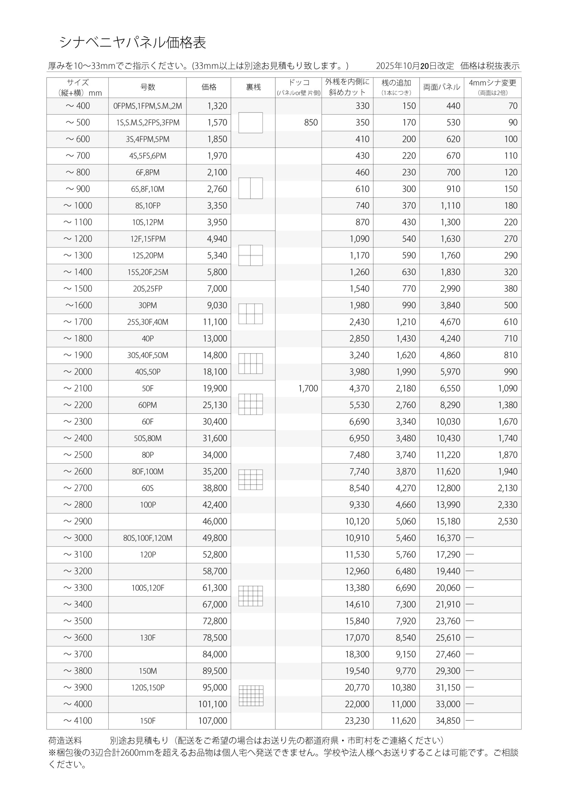 | 4mm厚シナに変更 | シナベニヤ(通常3mm厚)を4mm厚に変更します。 (縦+横 合計2901mm以上は基本仕様が4mm厚シナベニヤ使用になります。) |